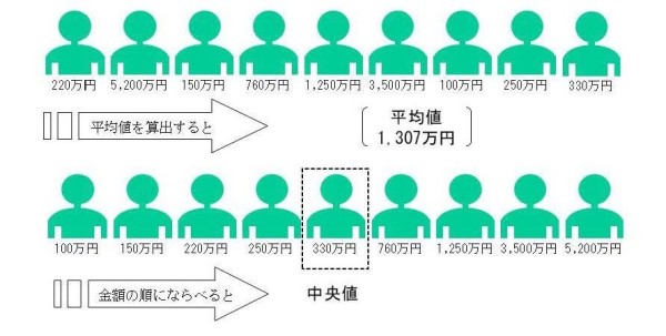 そこで中央値を用いることで一般的な家計像を捉えることができます。