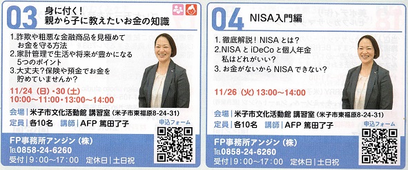 【11月24日(日)、26日(火)、30日(土)】米子まちゼミ【身に付く!親から子に教えたいお金の知識/NISA入門編】
